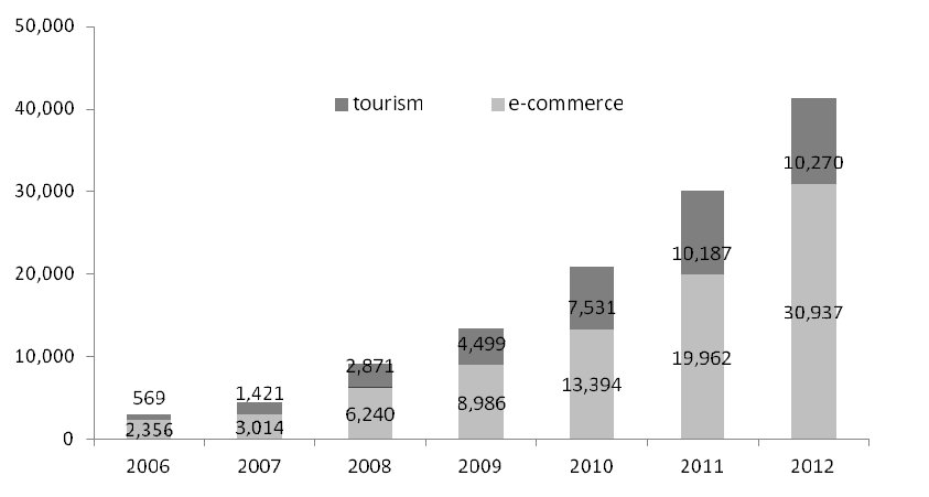 The economic outcome of INVIL programs has been confirmed by various statistics and empirical studies. In Gangwon Province, the revenues of INVILs were increased by 827.5 times in 2010 compared to 2001 (Whang 2012). The main factors contributing to revenue increase were the websites and knowledge sharing among community members (Jeong et al. 2010). To systematically enhance economic gains, MOSPA set up two central websites: one for selling local produce and the other for selling travel packages. The central agency provides consultation to rural farmers to help them develop new products, services and marketing tools. Revenues from the two online shopping malls in 2006 were $A3 million, which increased to A$40 million in 2012. During the same period, the average revenue per village increased from $A11,000 to $A114,000. In 2012, there were 1.1 million INVIL online shopping mall visitors and 176,181 purchases were made through the site. INVIL travel package visitors reached 310,000 and 38,443 purchased travel packages from the site (see Figure 1).